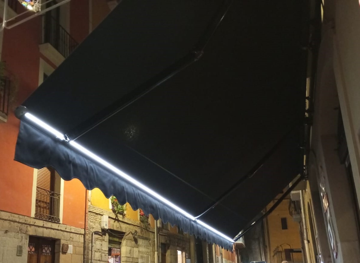 La iluminación del toldo es un elemento que aporta funcionalidad ya que alarga la estancia cuando se hace de noche, aportando visibilidad muy importante cuando se trata de locales comerciales y hostelería. Estética cuidada, un toque de distinción y confort.